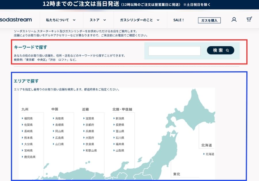 ガスシリンダー交換ができる店舗を調べる場合は、上記のソーダストリーム公式「お取扱店舗」ページから検索できます。
